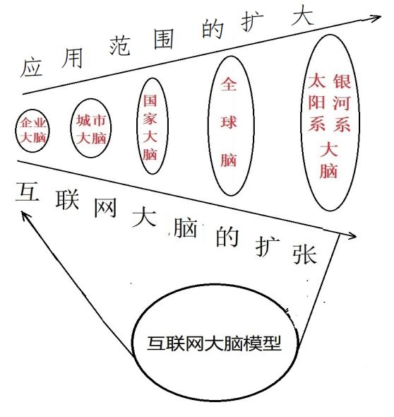 从互联网大脑的发展和与产业结合的趋势,伴随着互联网大脑模型的扩张和应用范围的扩大,产业分别出现企业大脑,城市大脑,国家大脑,全球脑,太阳系或银河系大脑。也就是说城市大脑的终点世界脑并不会局限在地球的范围内,而是随着人类在月球,火星建立基地,这个世界脑的范围会从地球不断扩张到太空深处。这已不在是科幻的想象,而是在未来已经可以实现的目标,如图7所示。